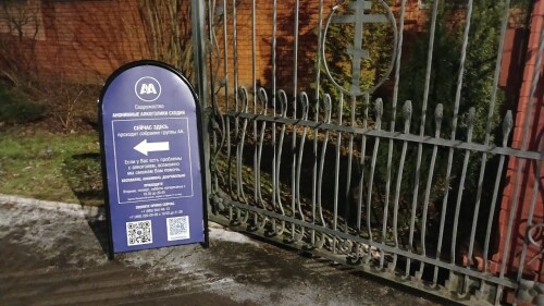 Члены группы АА «Сходня» (г. Химки, Московская область) выставляют штендер на время проведения собраний.